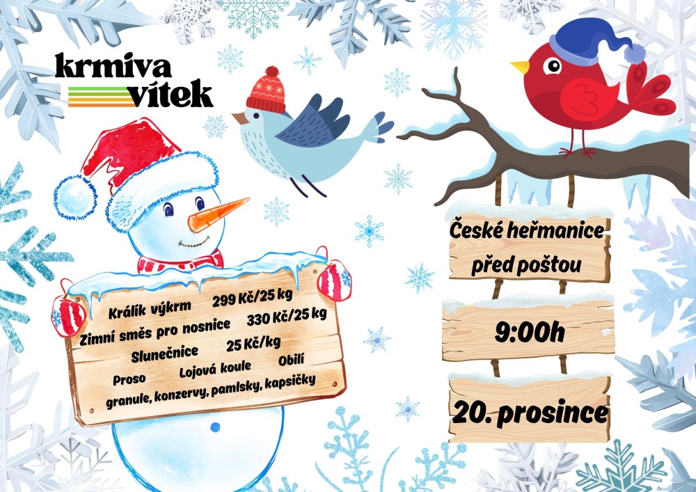 Firma Vítek bude v sobotu 20.12. v 9.00 hod před poštou prodávat krmiva pro domácí a hospodářská zvířata. Nyní v akci: Zimní směs pro nosnice 330Kč/25kg, Králík výkrm 299Kč/25kg, Slunečnice 25Kč/kg. Dále proběhne výkup králičích kůží za 15 Kč/ks.